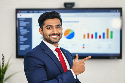 A young man in a business suit points towards a large screen displaying data visualizations, conveying confidence and presenting information.