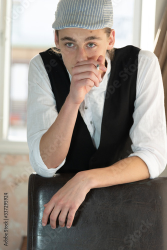 young, man, cap, window, engineer, waistcoat, harm, smoking, meeting, informal, cigarette, smoke, dialogue, hand