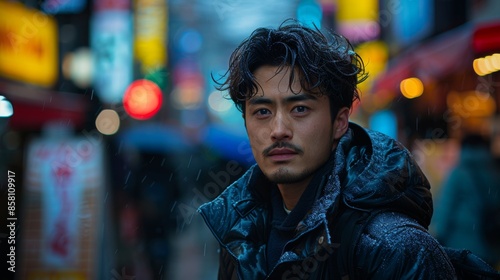 A young man in a city street during the rain, looking pensive and deep in thought amidst the urban life and illuminated signs, contemplating the hustle and energy of the city.