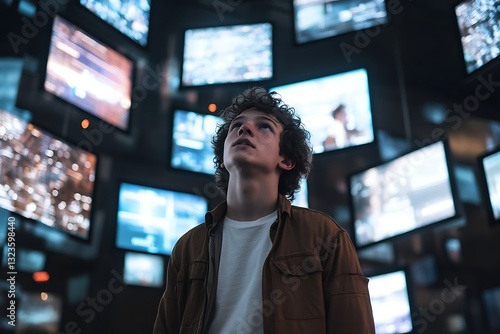 A young man in a white t-shirt and brown jacket gazes up at floating digital screens in a dark room, illuminated by cinematic lighting, showcasing his curly hair and a slight smile.