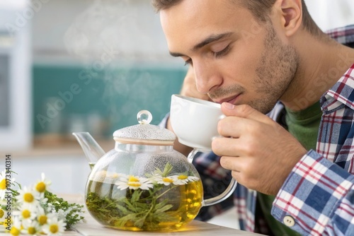 A young man is savoring a cup of herbal tea brewed with fresh flowers in a bright kitchen. The steam rises from the teapot, creating a calming atmosphere as he takes a moment for relaxation.