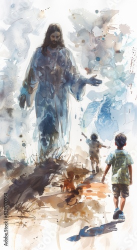 A young man is walking towards Jesus, who has his arms outstretched and stands behind the boy in light colors, in the style of watercolor, white background, soft tones
