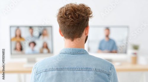 virtual, meeting, young, man, participate, look, multiple, screen, display, video, interface, network, career, software, computer, brainstorm, feedback, workspace, conference, idea, connection, business, discussion, emphasize, remote, setup, workflow, device