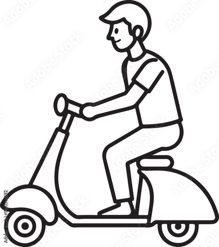 a young man riding a scooter line art, black outline, vector and illustration, coloring book page line art drawing