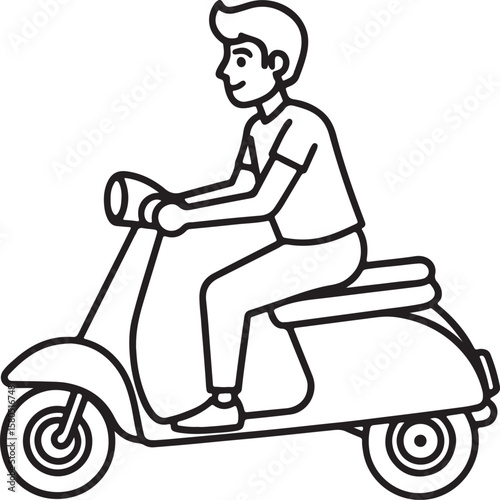 a young man riding a scooter line art, black outline, vector and illustration, coloring book page line art drawing