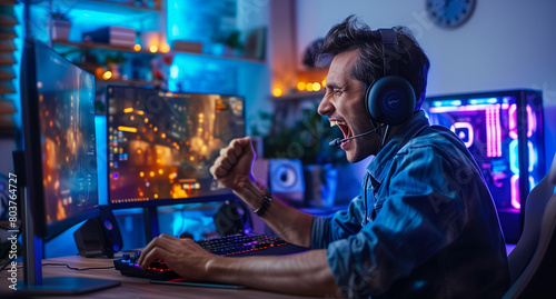 gaming, entertainment, player, tournament, computer, video game, display, earphones, cyberspace, sitting, technology, happy, modern, behind, home, backlight, desk, looking, dark, man, lifestyle, expertise, playing, microphone, electronic, headset, monitor, joy, fun, broadcasting, screen, excited, equipment, keyboard, online, earphones, smiling, teenage, succeed, winner, professional, male, club, arena, important, cyberspace