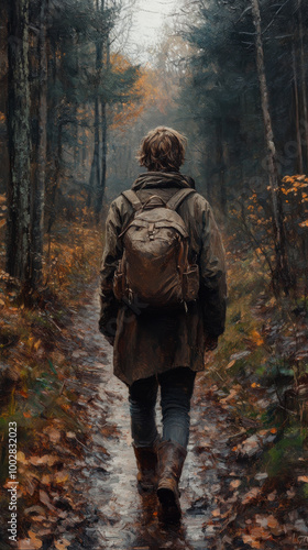 forest, trail, walking, man, young men, backpack, rain, rainy day, fall, autumn, leaf, brown leaves, tree, bare trees, jacket, jean, boot, hiking, nature, outdoors, landscape, path, timberland, fog