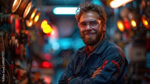 mechanic, man, workshop, garage, portrait, happy, smile, confident, goggles, tool, industry, service, automotive, engineering, professional, repair, maintenance, equipment, blue, work, collar, labor, skilled, trade, expertise, industrial, technology, sharpened, determination, gear, tool, uniform, workwear, working man, men at work, shopkeeper