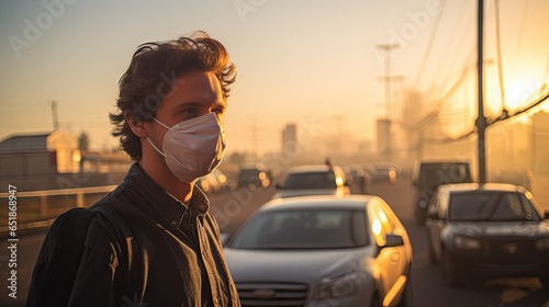 A young man wears an N95 mask to protect against PM 2.5 dust and air pollution. Behind there are cars passing by and there is a thin stream.