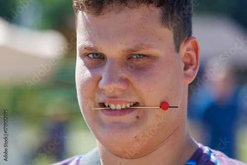A young man with a red stick in his mouth