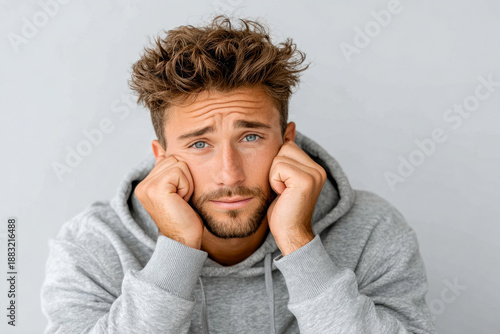 man, expression, concern, hair, youth, confusion, individuality, serenity, sorrowful, worry, contemplation, attitude, anxiety, calmness, simplicity, gaze, personality, thought, feeling, awareness, softness, hand, pensive, mood, mindfulness, insight, melancholy, identity, relaxation, vulnerability, communication, emotion, face, connection, emotion, portrait, grey, feature, trend, lifestyle, style, fashion, beauty, casual attire, aesthetic, closeup, youthfulness, introspection, expressionism