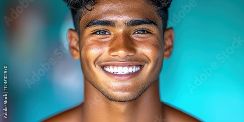A young man with dark curly hair and a warm smile poses against a vibrant blue background. His joyful expression radiates happiness under bright sunlight
