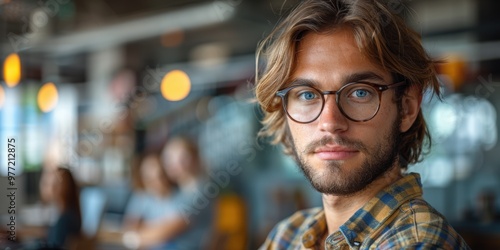 A young man with glasses and a plaid shirt is looking directly at the camera in a modern, well-lit office environment with blurred colleagues in the background