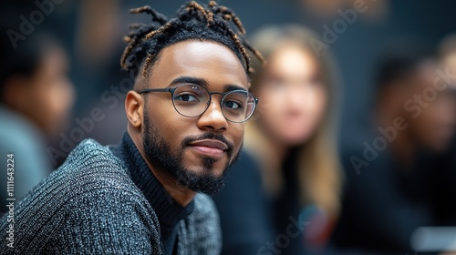 A young man with glasses and stylish hair sits thoughtfully, engaging with others.