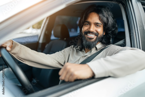 A young man with long hair and a beard enjoys driving, seated comfortably in his car while smiling at the camera. Sunlight filters through the window.