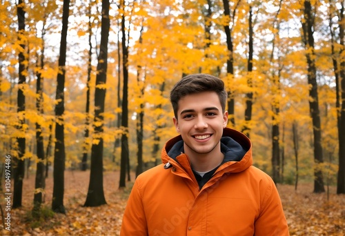 A young man with short brown hair and an orange jacket is standing in front of a forest covered in yellow leaves.