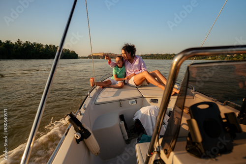 A young mother and a daughter enjoying a boat ride on a river during sunset. The child is pointing towards something in the distance while the woman smiles and looks in the same direction.