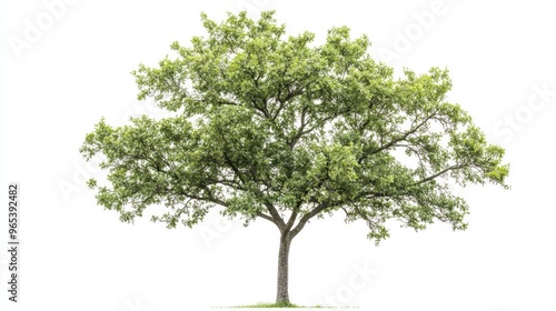 A young oak tree with new growth leaves and a slender trunk, isolated on a white background.