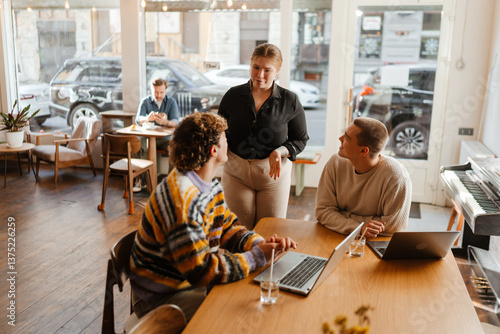 young, overweight, white, woman, 20s, client, talking, working, hot drink, shop, indoor, inside, adult, people, window, warm, cosy, interior, work, job, service, waitress, table, laptop, ordering, calm, relaxed, happy, wholesome, cafes