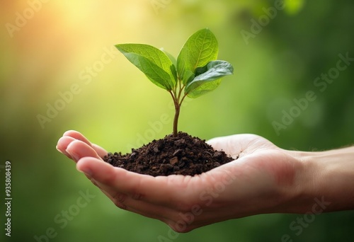 A young plant growing in rich soil held in open hands, symbolizing care, growth, and environmental sustainability against a soft, natural background.