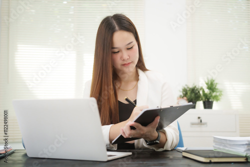 A young, professional businesswoman working at her desk in an office, providing online legal consultancy for disputed civil cases, addressing lawsuits, loan defaults, unfair dismissals, and property
