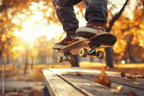 A young skateboarder performing a stylish boardslide trick on a wooden bench in the park, with a beautiful autumn morning in the background.