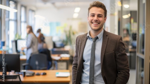 a young smiling caucasian businessman is standing in the office