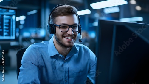 A young, successful call center manager in a headset works on a computer, engaging in video calls with customers or staff. Idea of a helpline.