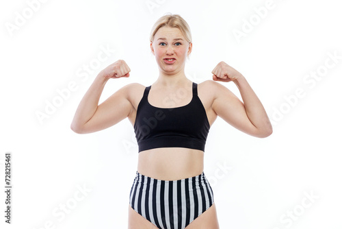 A young teenage girl in a sports swimsuit shows her biceps. A funny blonde with freckles in a black top and striped panties makes faces. White background.