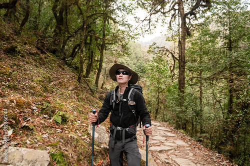A young traveller trekking on forest trail , Nepal