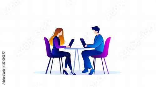 woman, man, laptop, table, work, team, collaboration, business, technology, office, meeting, modern, illustration, design, professional, productivity, efficiency, casual attire, young, adult, purple, blue, orange, white, minimal