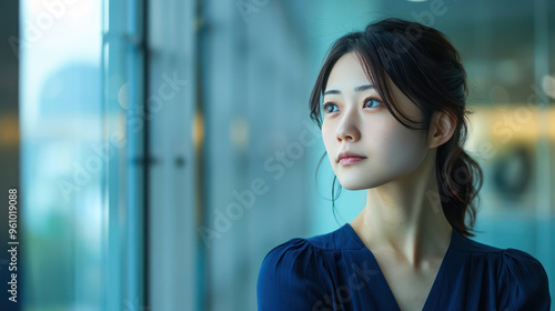 woman, young, thoughtful, window, modern, indoor, portrait, serene, beauty, blue, coiffure, looking, calm, natural, light, elegant, fashion, style, peaceful, contemplation, gaze, expression, soft, skin, eye, atmosphere, lifestyle, elegance, casual attire, clothing, sitting, indoor, profile, calmness, day, youth, happiness, smile, joy