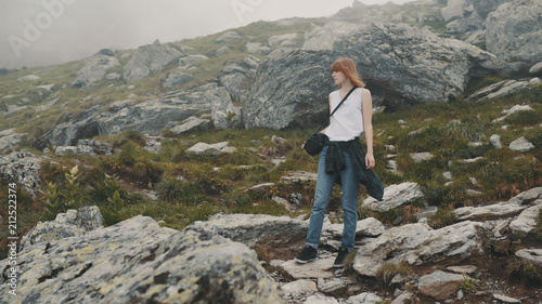 A young woman hiker walks in the mountains with photo camera. Transfagarasan, Carpathian mountains in Romania