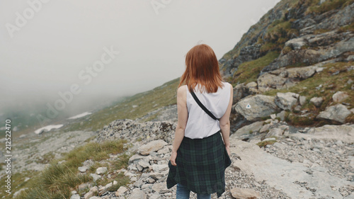 A young woman hiker walks in the mountains with photo camera. Transfagarasan, Carpathian mountains in Romania