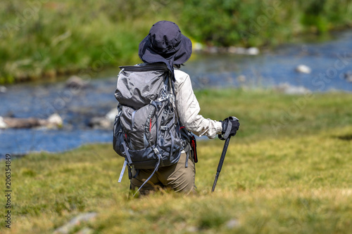 A young woman hiking on a mountain path along the river on Italian alps. A female with hat and backpack, holds trekking poles in her hands with gloves. Relaxing alone in a beautiful summer sunny day.