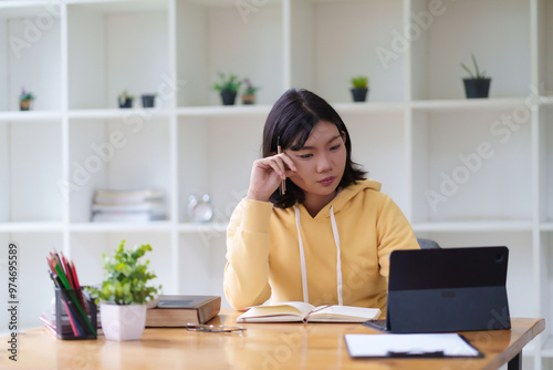 woman, typing, laptop, yellow, hoodie, working, indoor, window, light, casual attire, bright, sharpened, technology, greenery, productivity, education, nature, comfortable, study, modern