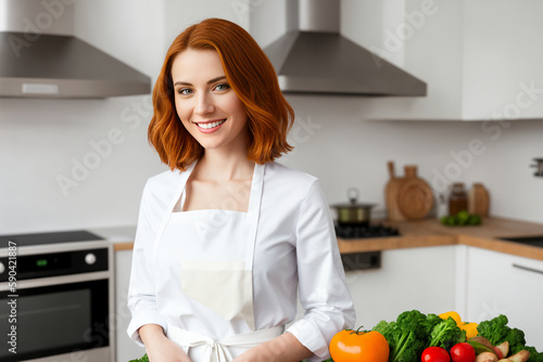 A young woman in an apron prepares a healthy food of vegetables in the kitchen. Generative ai.