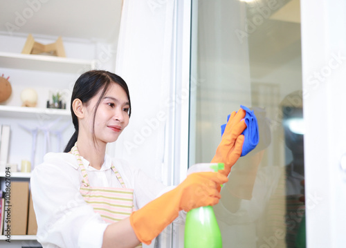 A young woman is cleaning and spraying cleaning liquid on the glass and wiping the windows at home.