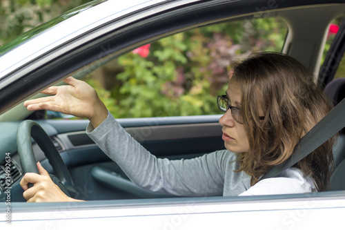 car, woman, sitting, female, beautiful, driver, young, people, person, girl, adult, travel, road, vehicle, driving, window, goggles, angry, nervous, brunette, traffic, stress, problem, anger, congestion