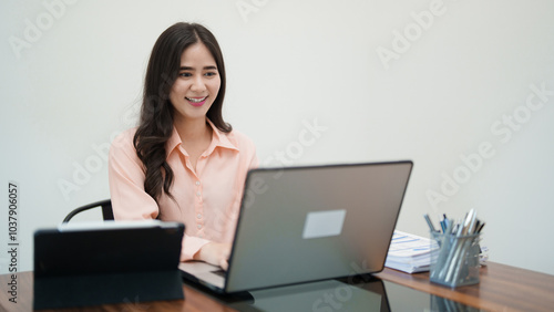 A young woman is sitting at her desk in an office, working on her laptop. She looks focused and engaged, with office documents and a coffee mug beside her, in a bright, modern workspace