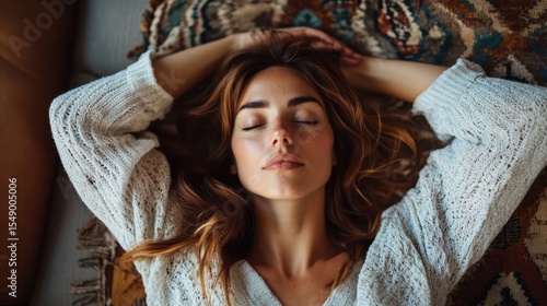 woman, relaxation, peace, joy, cosy, serenity, comfort, calm, happiness, calmness, emotion, lifestyle, harmony, beauty, intimate, home, soft, knitted, style, casual attire, modern, morning, natural, light, wellness, portrait, sleeping, dreaming, leisure, detail, sofa, chic, peaceful, warmth, indoor, atmosphere, emotion, contentment, clothing, decor, inviting, stylish