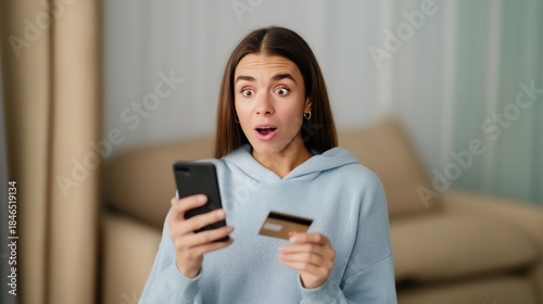 A young woman looks surprised and delighted while using her mobile and holding a credit card in a comfortable room