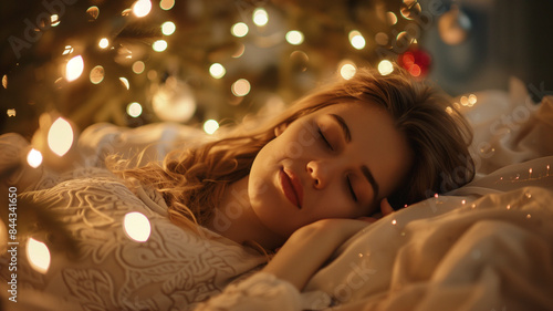 A young woman lying in bed with a serene expression, bathed in the warm glow of a Christmas tree, dreaming of festive presents. Ai generated
