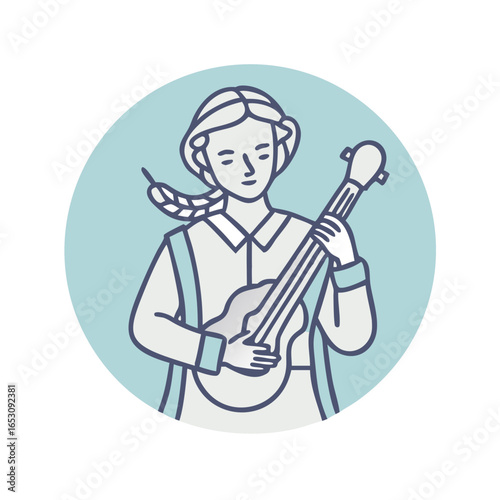 vector, fantasy, woman, young, guitar, acoustic, music, play, instrument, sound, folk, singing, entertainment, concert, line, outline, symbol, illustration, graphic, design, character, avatar, game, mobile, app, performance, musician, leisure, hobby, recreation, minimalist, simple, cute, pastel, blue, grey, white, modern, digital, element, web, isolated, circle, audio, rythm, icon
