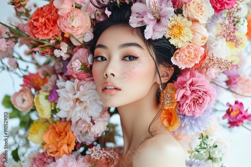 A young woman poses gracefully with a vibrant arrangement of various flowers framing her face, highlighting her natural beauty and expressive features