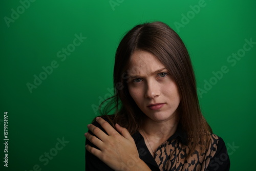 A young woman poses in a studio with a green background, showing natural emotions, full of expressions and dynamic movements. Unedited image