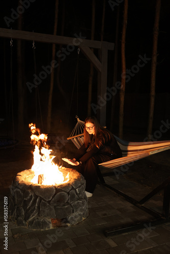 A young woman relaxes on a striped hammock by a cozy firepit at night in a pine forest. Peaceful outdoor scene with soft lighting and natural vibes.
