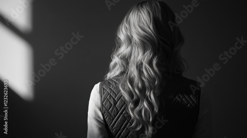 A young woman seen from behind, her long, wavy hair cascading down her back as she slightly turns her head