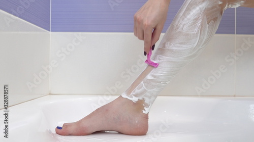 A young woman shaves hair on her legs. The girl applied shaving foam on her leg and started shaving.