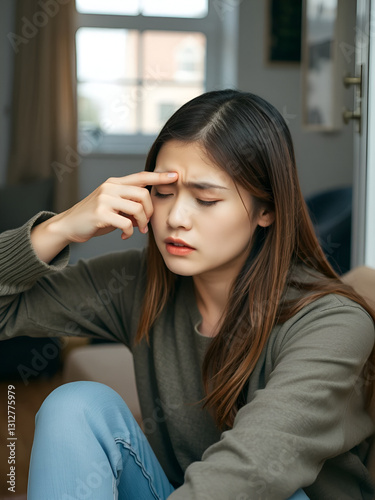 A young woman sits indoors, pinching the bridge of her nose with her eyes closed, showing signs of stress or a headache. The scene conveys pain, fatigue, or emotional strain. Health or stress themes.